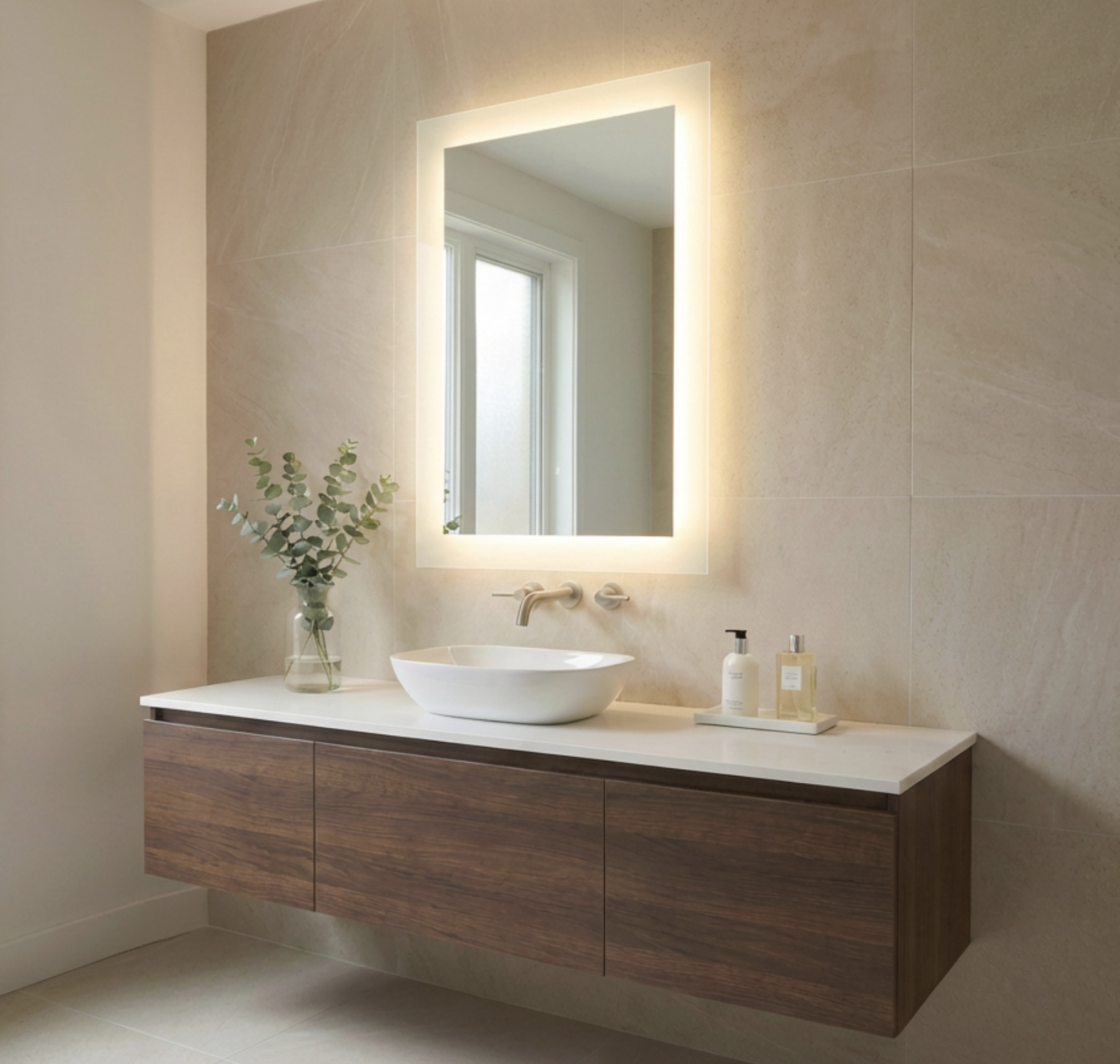 With a frameless design and silver finish, this LED mirror is the best upgrade for a bathroom or powder room. It provides the perfect lighting for grooming and getting ready.